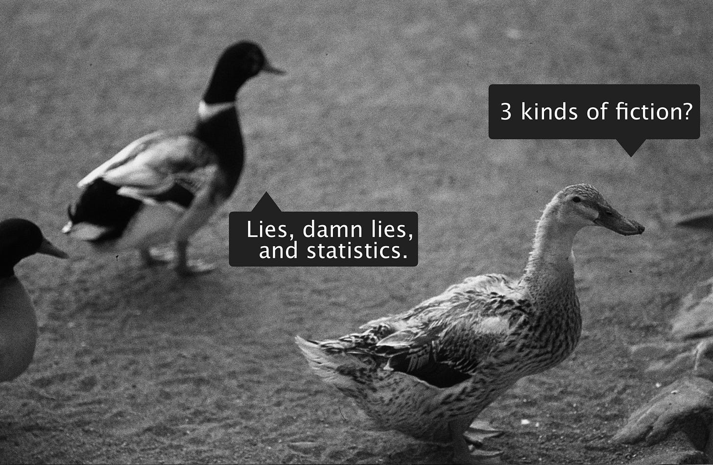 Fiction is, of course, so broad a term as to be next to useless as a categorization. So, instead, we have divided and subdivided it over the years into genres, media, and marketing labels. In truth, this process is ongoing5. Bookstores and libraries give us science-fiction, literary fiction, narrative fiction, travel fiction and so on, while the internet brings about new technologies like interactive fiction. But, in the end, each new hyphenate and sub-category are just another way of telling us, the audience, that this is a made-up story. Do with it what you will.